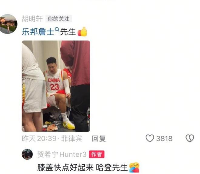 在世预赛的比赛结束之后,胡明轩第一时间在贺希宁的社交平台留言,点赞好兄弟的表现,而贺希宁也回应谈到了小胡的伤病情况。大概的意思就是说希望小胡的膝盖伤病赶紧好起来。从好兄弟的这番话我们才知道,原来胡明轩的他的膝盖伤病一直都没有痊愈。虽然说此前全运会的比赛,就已经隐隐透露出类似的一些问题,但是这几个月时间以来,胡明轩时不时也在国内打比赛,这一次也跟随国家队去到日本,去到菲律宾。所以大家都觉得胡明轩的身体恢复已经差不多了,只是为了保险没有上场比赛而已,没想到现在还是有挺严重的问题。